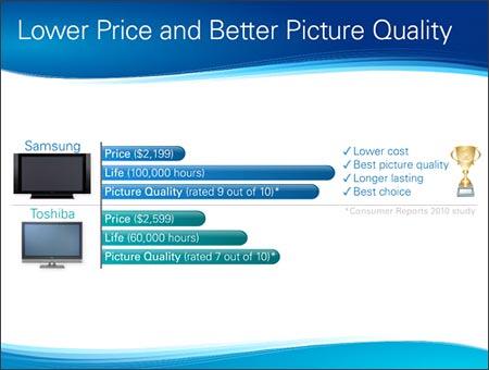 You: “$2,199 compared to $2,599 for the Toshiba. You save $400 and the Samsung lasts 40,000 hours longer than Toshiba’s TV.”