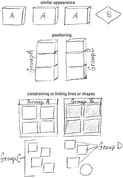 There are three ways to group elements: using a similar physical appearance, organized positioning, and constraining or linking lines or shapes.