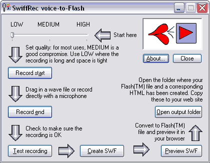 SwiffRec is a great free tool from the same people who provide Powerbullets, another amazing program that's also freeware. SwiffRec does just one thing - it allows you to record your voice or take an existing sound file and convert it to Flash.